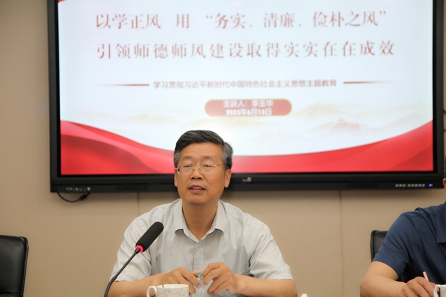 根据学校主题教育工作安排,6月13日下午,党委副书记李玉华以“以学正风,用‘务实、清廉、俭朴之风’引领师德师风建设取得实实在在成效”为题,在学术会议中心第五会议室讲授主题教育专题党课。