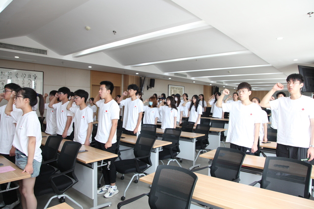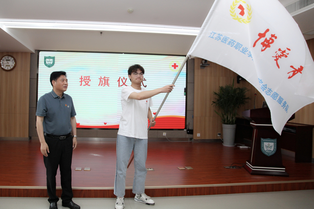 副院长王辉为志愿者团队授旗,大大鼓舞了志愿者们的信心和士气。全体志愿者在吴晗老师的带领下进行宣誓,承诺践行社会主义核心价值观,弘扬“人道、博爱、奉献”的红十字精神,用智慧和汗水,谱写新时代文明实践篇章。