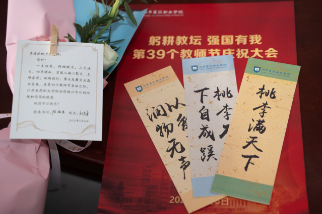 伴随着我校教师节主题片《躬耕教坛,强国有我》的播放,庆祝大会拉开了帷幕。主题片一帧帧画面勾勒的是校园里师生交流的温馨场景,一个个镜头捕捉的是老师们在教学各环节潜心教学的精彩瞬间,一幅幅照片定格的是领导班子走访慰问一线教师的暖心时刻,引起了现场老师们深深的情感共鸣。座位上提前摆放了为每位老师独家定制的鲜花、贺卡和书签,这是专属于每个辛勤奉献的苏医人的特别心意,承载着的是对每一位老师的深情厚义和殷勤嘱托;定制书签,寓意桃李满天下的美好祝愿和阅读人生的切切呢喃。
