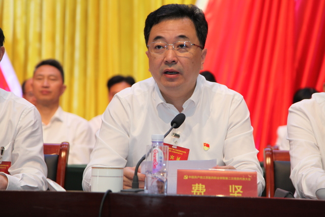 费坚代表中共盐城市委向大会的召开表示热烈祝贺。他指出,江苏医药职业学院党委团结带领全校党员干部、广大师生员工,深入贯彻落实党的教育方针,坚持社会主义办学方向,锐意进取、开拓创新,学校事业发展取得了显著成绩。当前学校正处在事业发展的关键时期,开好第二次党代会,对于学校在更高起点上实现新突破具有重大意义。费坚代表市委对学校事业发展提出了三点希望:一是坚守立德树人的初心使命,打造卫生人才的培养基地;二是坚定服务地方思想自觉,打造校地融合的发展高地;三是坚持职业本科内涵建设,打造科技创新的前沿阵地。费坚表示,盐城市委市政府也将一如既往关心和支持江苏医药职业学院的建设和发展,为学校创造良好的发展环境和发展条件,助推学校在新的征程中取得更大成就。