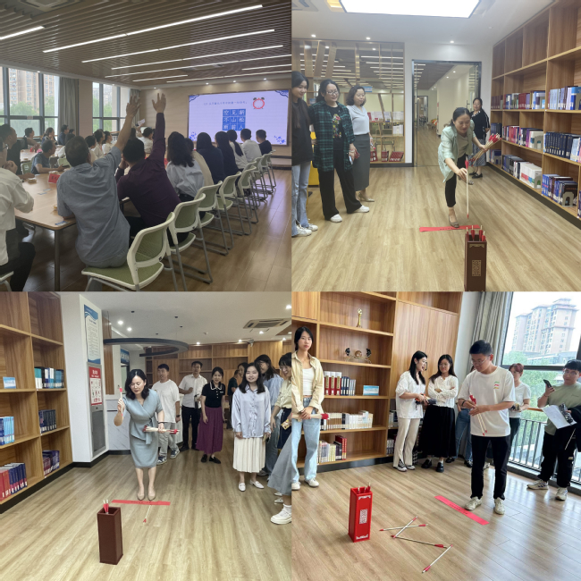 诗词大会环节,参赛者分组抢答,题型多样,现场紧张激烈,扣人心弦。紧张的诗词大会结束后,进入轻松欢快的投壶比赛环节,参赛教师手执箭矢,躬身投壶,以入壶箭数论输赢。活动结束后,图书馆为每一位参加活动的老师准备了中秋小礼品。