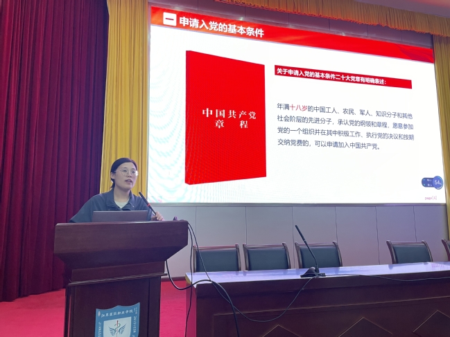 刘坪楚老师从大学生入党条件、党员发展流程及入党申请书的撰写要求三个方面向同学们介绍了大学生党员发展的相关知识。她结合学院实际,将学生党员发展条件和流程细化,为同学们指明了努力的方向。她鼓励同学们提高自我要求,将入党热情转化为实际行动,争取以优异成绩早日加入党组织。