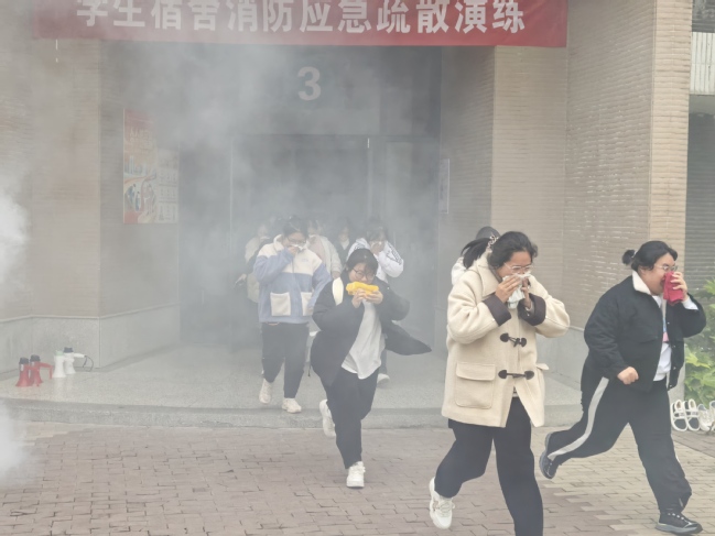 随着消防警报的拉响,疏散演练正式开始。宿舍楼内烟雾弥漫,同学们迅速用湿毛巾捂住口鼻,弯腰低姿,按照预定的疏散路线,有序撤离。各班级辅导员和楼层引导员各司其职,认真组织学生疏散,确保每一位学生的安全。在疏散过程中,师生们保持冷静,行动迅速,仅用了4分钟,1000余名学生就全部安全撤离到了指定的集合地点。整个疏散演练过程紧张有序,达到了预期的效果。