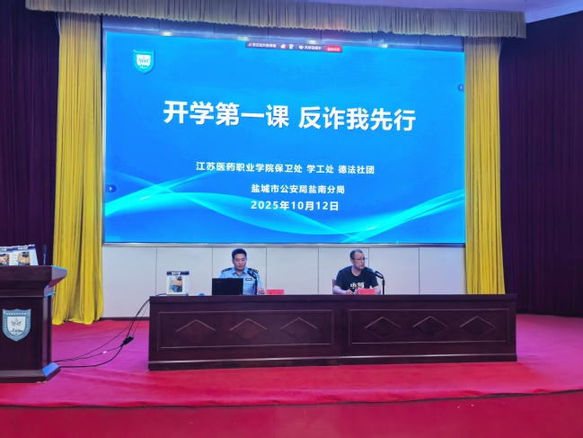 为增强新生的防范电信网络诈骗意识,提升自我保护能力,营造安全、和谐、无诈的校园环境,10月12日下午,由我校保卫处、学工处与德法社团联合主办,盐城市公安局盐南高新区分局协办的“开学第一课 反诈我先行”安全教育讲座在国际会议中心举行。活动特邀盐南分局反诈中心主任陈辉担任主讲,采用线上线下相结合的方式同步开展。讲座由保卫处处长赵亮主持。