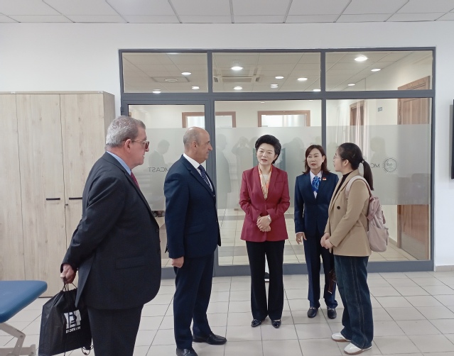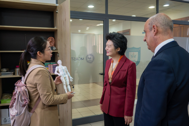 会谈前,谭颖主任一行在维拉校长的陪同下,参观校园并实地考察了郑和学院配备推拿床、艾灸设备、针灸模型等专业教具的教学场地,详细了解教学运行情况,对学校境外办学的扎实成效给予充分肯定,并强调要持续强化课程与技术的本土化适配。