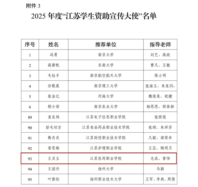 近日,江苏省教育厅公布2025年“苏乡永助”资助育人主题活动评选结果,我校斩获两项重要荣誉,实现历史性突破。其中:医学院辅导员吴桂琴老师牵头的《“五精”资助育仁心 赋能发展塑医魂》工作案例入选省级资助育人优秀工作案例;公共卫生与管理学院王灵玉同学(指导老师尤成、曾伟)当选省级学生资助宣传大使,两项成果均为我校首次入选,充分彰显了我校在资助育人领域的扎实成效与创新探索。