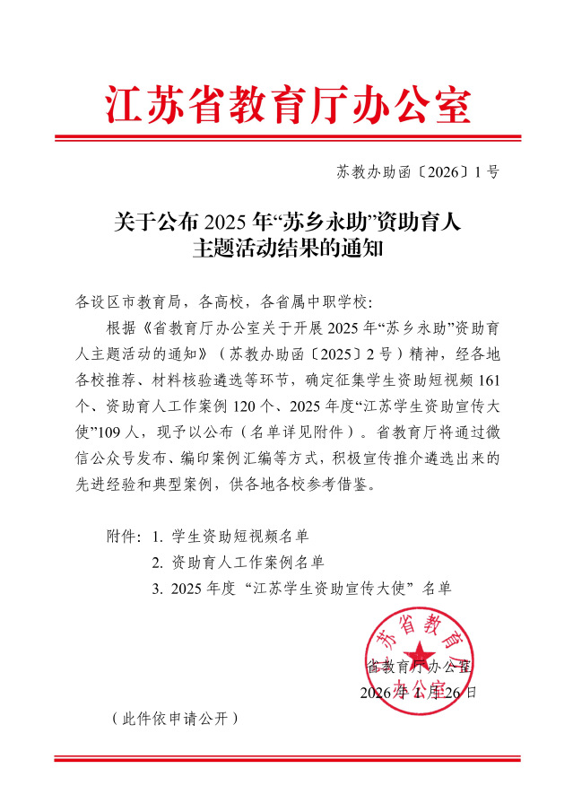 学校始终以立德树人为根本任务,深入贯彻落实国家资助政策,高度重视“苏乡永助”主题活动开展。为交出优异答卷,学校精准把握活动内涵与育人方向,将发展型资助理念深度融入活动全过程,创新“线上+线下”联动模式,精心组织学生资助短视频、工作案例、宣传大使等多项征集活动,经校内严格遴选推荐,择优上报优秀成果参与省级评审,形成了全员参与、全程发力的良好育人氛围。